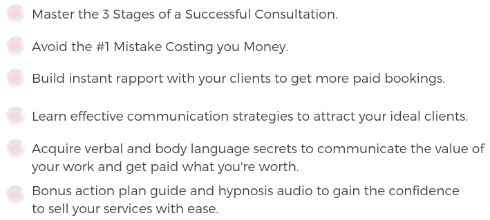 In this 3 day video course, I'll teach you everything you need to know to establish immediate connection with your prospective clients, how to have engaging consultations, and how to effectively get your potential clients to commit to your services and pay you what you're worth.